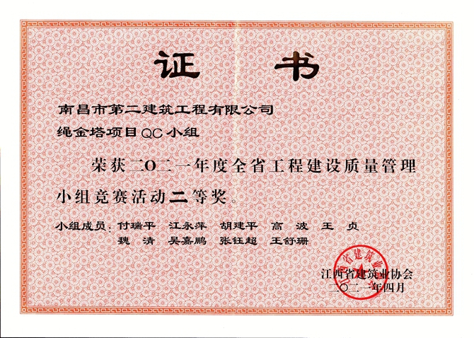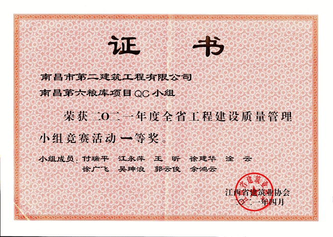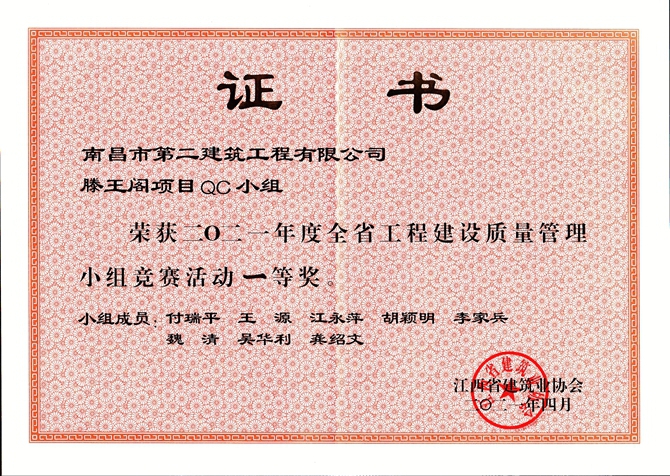 4月27日,江西省建筑業(yè)協(xié)會召開全省建筑業(yè)全面質(zhì)量管理成果發(fā)布會,我司報送參賽的南昌第六糧庫項目QC小組的《提高軟弱地基強夯施工一次驗收合格率》QC成果和滕王閣項目QC小組的《提高古建砼戧梁驗收合格率》QC成果獲得一等獎,繩金塔項目QC小組的《提高高空弧形挑檐施工質(zhì)量》QC成果獲得二等獎,為促進企業(yè)技術(shù)創(chuàng)新和科技進步、提升企業(yè)品牌形象添勁加力。